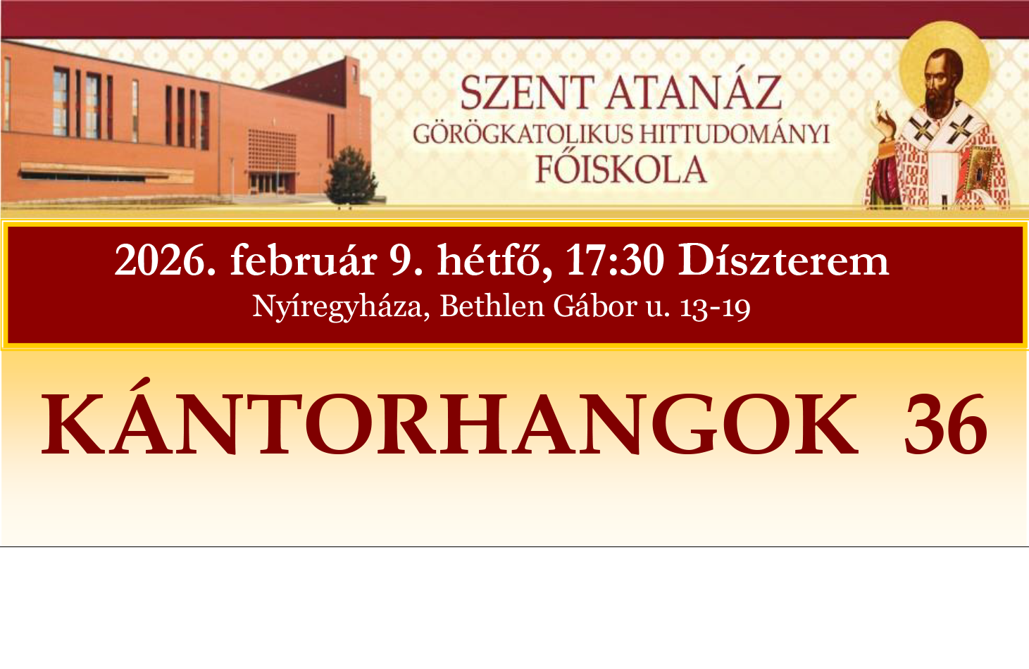 Február 9-én (hétfőn) 17.30 órakor kántor szakos hallgatóink hagyományosan megrendezendő félévi vizsgakoncertjére várjuk az érdeklődőket a főiskola Szent Atanáz termébe.