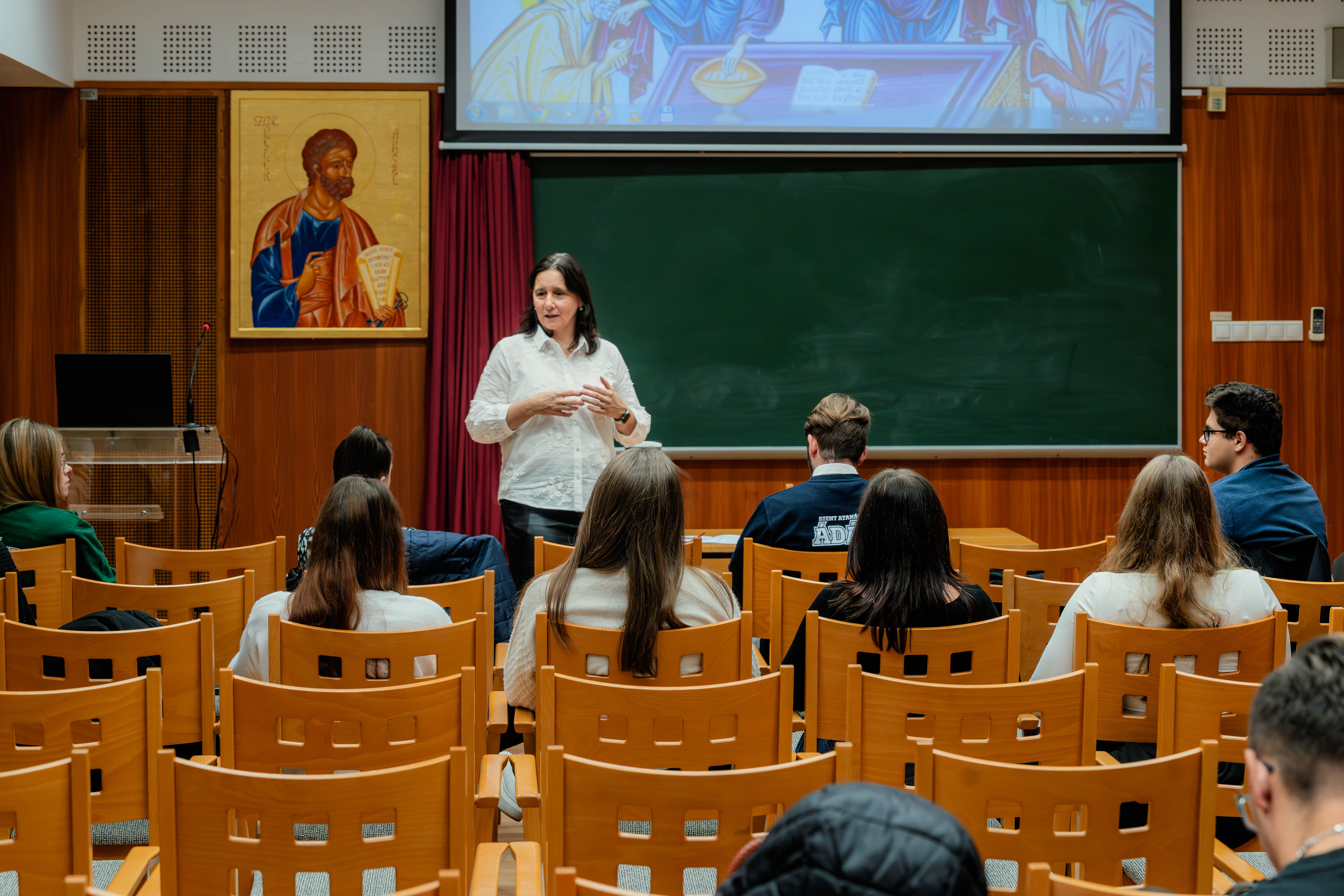 A köszöntőt követően dr. Inántsy-Pap Ágnes tanárnő mutatta be részletesen a választható szakokat: alap-, osztatlan- és mesterképzéseket. A prezentációt megelőzően egy, a hallgatók közreműködésével készült kedvcsináló videót mutattunk be a főiskoláról, melyet Farkas Friderika V. éves hittanár-nevelőtanár szakos diákunk készített hallgatótársai segítségével.